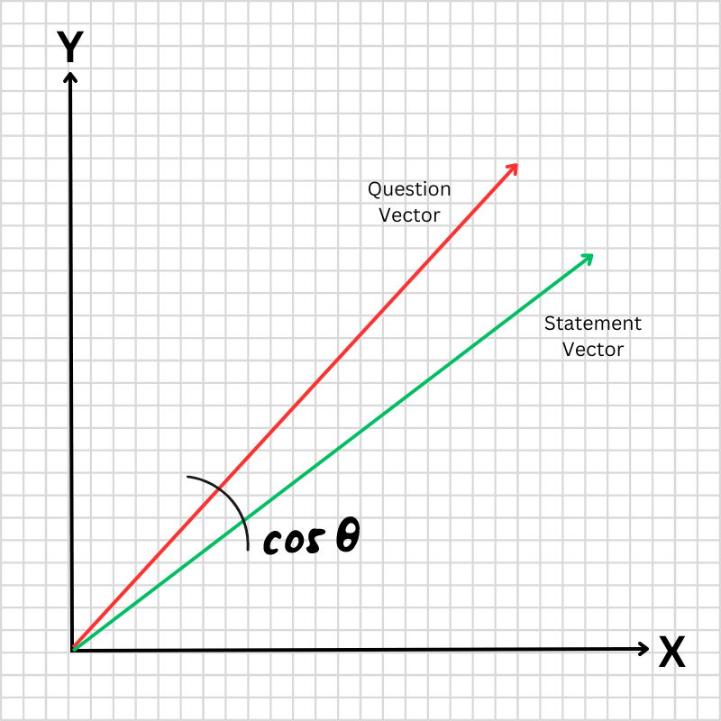 What the language model is trying to assert is to “find” the statement “vector” that is the closest to the question vector. It does so by performing (again, this is not completely accurate, but good enough for base understanding) a simple math assertion (without going neck deep into the math):